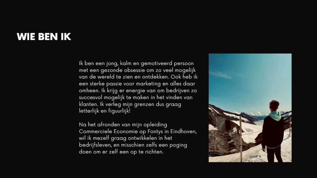 Op deze pagina vind je mijn Brandbook. Een creatief en duidelijk overzicht van wie ik ben als persoon en wat mijn ambities zijn op zakelijk gebied.