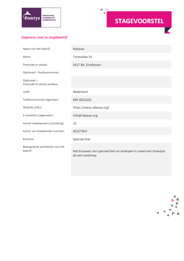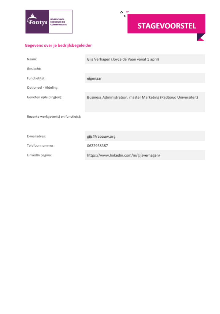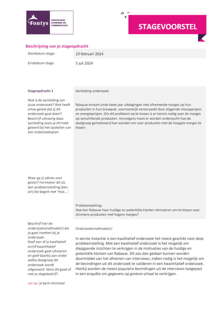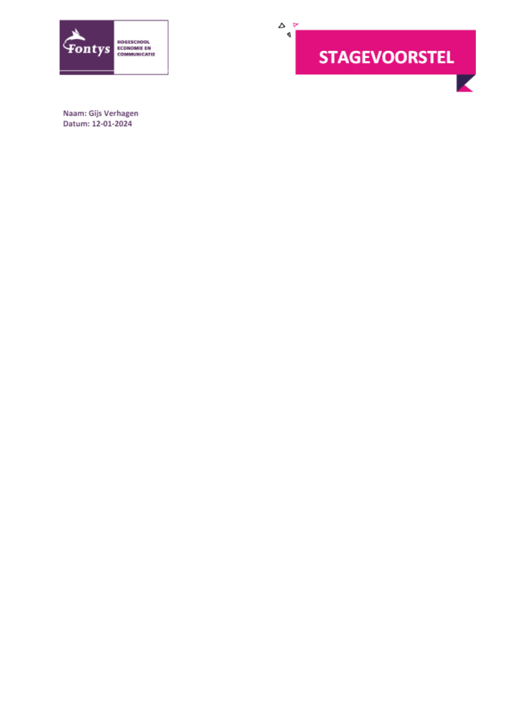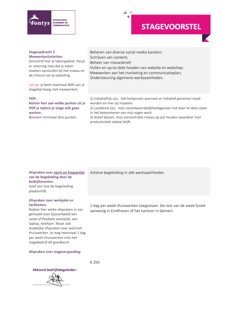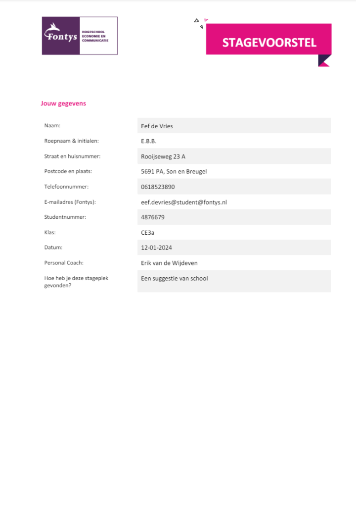 Hieronder is een stageovereenkomst te zien. In het stage voorstel zie je de basisinformatie van het stage bedrijf. Daarnaast zie je een eerste versie van de probleemanalyse voor een onderzoek dat ik tijdens mijn stage zal uitvoeren.